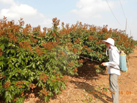 對于花帶葉和沖梢的類型,進(jìn)行脫小葉處理。在荔枝妃子笑品種上進(jìn)行化學(xué)藥劑脫小葉處理:國光乙烯利3-5ml/15kg,配合磷鉀營養(yǎng)。白糖罌等品種上不進(jìn)行化學(xué)藥劑脫小葉處理,一般進(jìn)行人工摘葉處理。