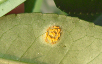 主要為害成熟或近成熟葉片。葉片染病葉背面現(xiàn)黃色、裸露的夏孢子堆,大小0.2—0.4mm,圓形至橢圓形,包被破裂后變?yōu)槌赛S色,后又褪為淺黃色,在與夏孢子堆對應(yīng)的葉正面現(xiàn)紅褐色斑塊,秋后又形成冬孢子堆,圓形,大小0.2—0.7mm,橙黃色至暗黃色,嚴(yán)重時孢子堆擴展至全葉。