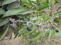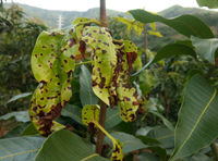 癥狀:主要危害新梢,花穗,幼果和壯果,此病可引起葉斑、梢枯、落花、落果和果腐,并有明顯潛伏現(xiàn)象。葉片感病后現(xiàn)不定形圓形或半圓形褐斑。枝梢、花穗染病變褐色枯死,梢期表現(xiàn)為葉片上病斑初期為小黑點(diǎn),逐步擴(kuò)大干枯穿孔,影響光合作用;花期容易在花桿部造成逐步擴(kuò)大病斑、干花;危害幼果和采收前的果實(shí)、果面現(xiàn)形狀不一稍凹陷的紫褐色至黑色病斑,潮濕時現(xiàn)朱紅色粘質(zhì)小點(diǎn),隨后病斑連成斑塊,至全果變黑腐爛、幼果皺縮脫落。