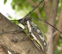 發(fā)生規(guī)律:脊胸天牛屬鞘翅目天?疲饕杂紫x蛀食樹干、主枝,影響水分和養(yǎng)分的輸導(dǎo)。每年發(fā)生1代,跨年完成。幼蟲在蛀道內(nèi)越冬,大部分在2~4月化蛹,4~5月大量成蟲出現(xiàn)。成蟲羽化、交尾、產(chǎn)卵等活動均在夜間進(jìn)行,白天多棲息在葉片濃密的枝條上。交尾后的雌蟲大多數(shù)產(chǎn)卵在枝條末端的芽痕或枝條傷口的皮層與木質(zhì)部之間的縫隙中。成蟲壽命14~35天,卵期10~12天。幼蟲孵化后即蛀入枝條向主干方向鉆蛀,在孔道內(nèi)開一個通氣和排泄的孔洞,洞口外常黏附有樹液、木屑、蟲糞等黑褐色的混合物,這是天牛危害的重要標(biāo)志。幼蟲期長達(dá)265~311天,老熟幼蟲在蛀道內(nèi)化蛹,蛹期30~50天。