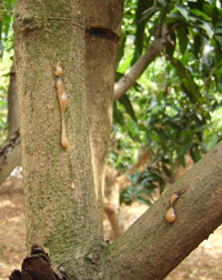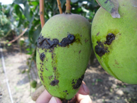 發(fā)病規(guī)律:病原為半知菌亞門擬莖點(diǎn)(Phomopsis mangiferae)和色二孢霉(Diplodia mangiferae)病菌均以菌絲體和子實(shí)體(分孢器)在病株和病殘體上存活。氣溫適宜時,分孢器涌出大量分生孢子,借風(fēng)雨傳播,主要從傷口侵入致病。溫暖多濕有利于病菌繁殖傳播侵染,植株、果實(shí)病、蟲傷口多樹勢哀落的果實(shí)發(fā)病較重。