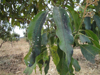 癥狀:該蟲以芒果嫩葉為食料,每年5~11月均有發(fā)生,主要以幼蟲危害嫩葉、葉柄和主脈,被害葉呈褐斑狀,與葉斑病近似,葉背面有小點(diǎn)凸起,后期穿孔破裂,葉片卷曲,嚴(yán)重時致辭使葉片枯萎脫落甚至梢枯,造成植株生長衰弱。