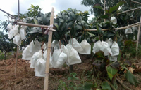 2、在第二次生理落果后,剪除影響果實發(fā)育的花梗與枝條,疏除畸形果,病蟲果及過小的敗育果,兩個果粘在一起的易拈惹蟲害,應去除一個,一穗果保留3-4個發(fā)育正常的果即可。對未結(jié)果或開花不結(jié)果的枝條可酌情短截,促進抽梢,培養(yǎng)來年的結(jié)果母枝,也可增加樹冠的透光度。