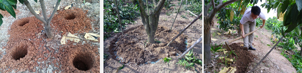 為了促進(jìn)芒果根系正常生長和再生,在不同時期應(yīng)對果園做深耕和翻土處理。冬季(或采果修剪后)應(yīng)結(jié)合深翻改土,沿樹冠垂直線下挖(60cm深、30cm寬)環(huán)溝、對溝或圓形溝,切斷土壤下層的粗根,經(jīng)曬五、六天,然后施采果肥,用表土和植物殘體加以回填。結(jié)合清園,進(jìn)行中耕翻土(20cm深),以切斷表土的吸收根,減弱地下部分對地上部分水分和養(yǎng)分輸送,有利地上部分營養(yǎng)物質(zhì)積累,促進(jìn)花芽分化。