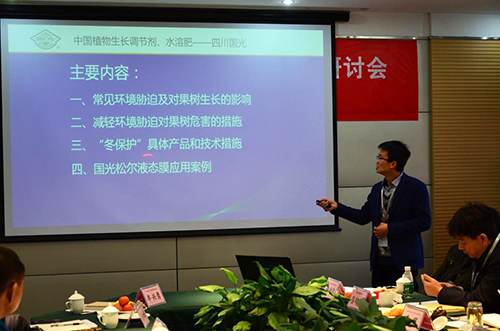 2016年12月3日,由中國農(nóng)藥發(fā)展與應(yīng)用協(xié)會(huì)植物生長調(diào)節(jié)劑專業(yè)委員會(huì)主辦,國光股份承辦的“植物生長調(diào)節(jié)劑新應(yīng)用、果樹冬保護(hù)專題研討會(huì)”在四川成都召開。全國農(nóng)業(yè)技術(shù)推廣服務(wù)中心農(nóng)藥與藥械處處長王鳳樂、中國農(nóng)藥發(fā)展與應(yīng)用協(xié)會(huì)副秘書長花榮軍、全國農(nóng)業(yè)技術(shù)推廣服務(wù)中心防治處高級(jí)農(nóng)藝師李萍、中國農(nóng)藥發(fā)展與應(yīng)用協(xié)會(huì)植物生長調(diào)節(jié)劑專業(yè)委員會(huì)主任胡興啟、中國農(nóng)業(yè)大學(xué)農(nóng)學(xué)院教授、長江學(xué)者、植物生長調(diào)節(jié)劑專家段留生以及四川、河南、山東、江蘇、陜西、福建、湖南、湖北、廣西等省的省植保站站長、省農(nóng)業(yè)科學(xué)院、林業(yè)科學(xué)院的研究員、教授等17人參加研討。